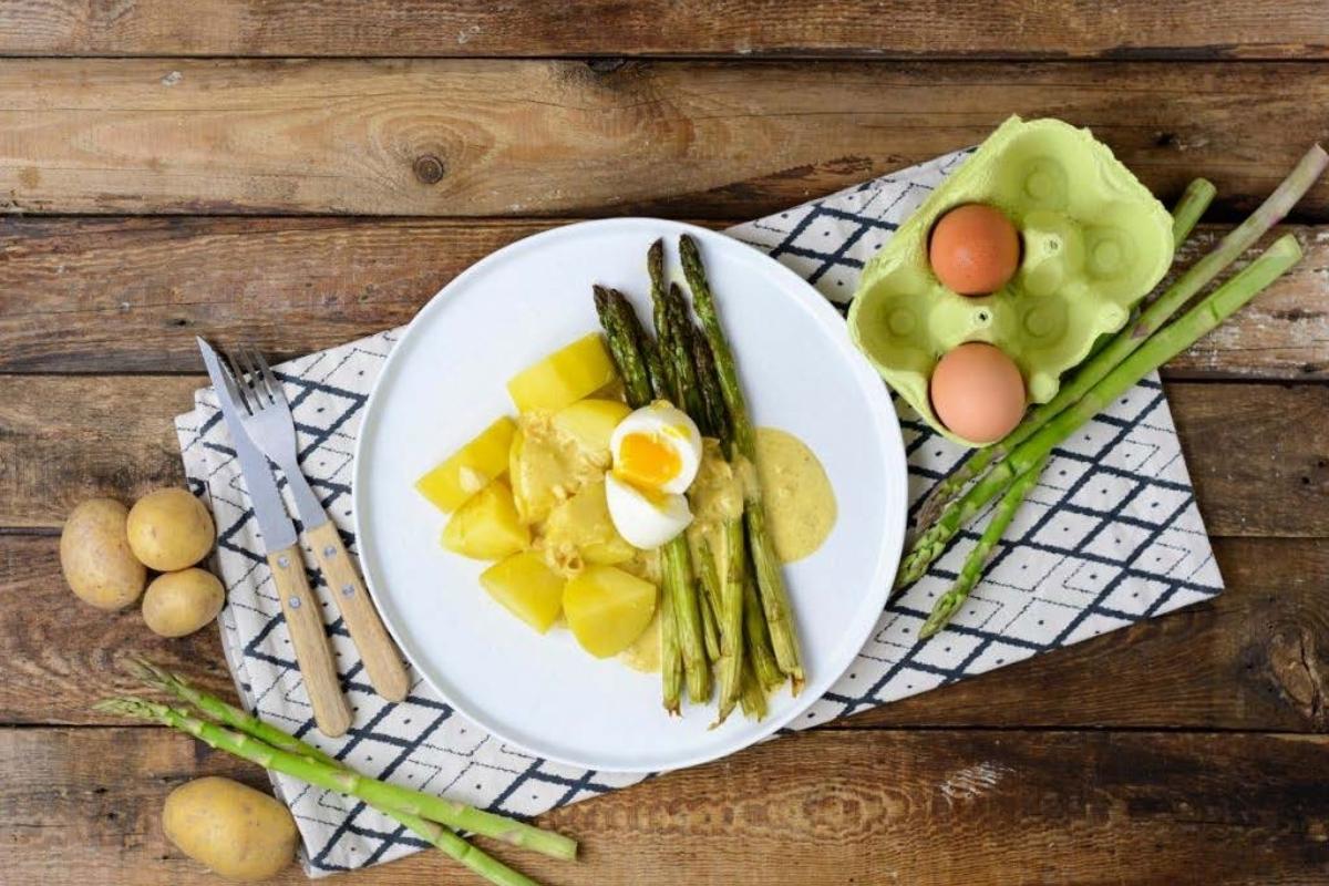 Grüner Spargel mit Weißwein-Kräuterrahm. Der grüne Spargel wächst oberirdisch und wird durch die Photosynthese grün.