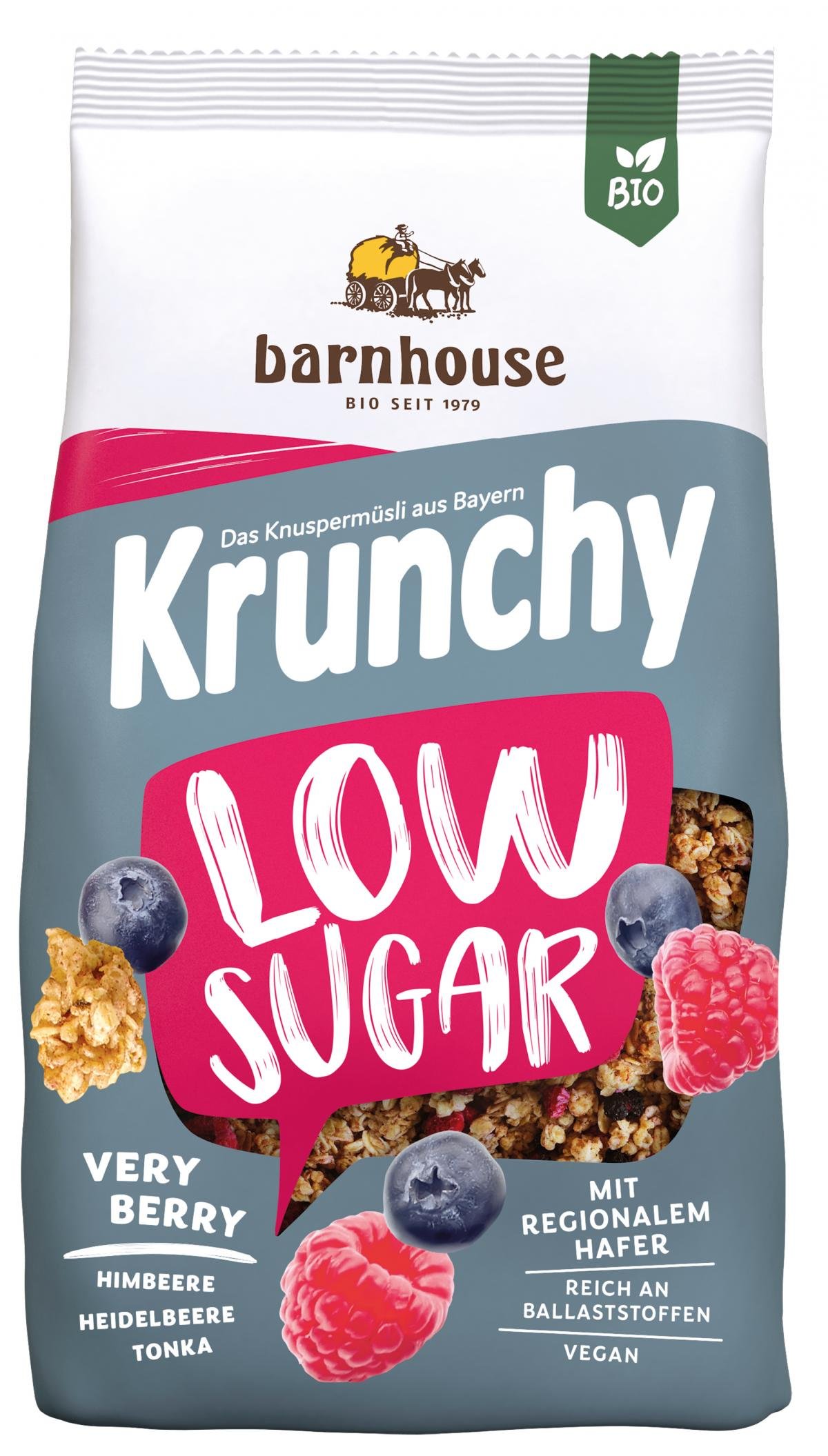 Mit KRUNCHY LOW SUGAR erwartet euch eine kleine Knuspermüsli-Sensation – ein wunderbares Krunchy, das ebenso zuckerarm wie köstlich ist. Voller, unverfälschter Genuss in Barnhouse-Qualität für alle, die bei ihrem Müsli besonders auf wenig Zucker achten oder bisher deshalb Knuspermüsli gemieden haben.