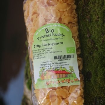 Regionale Hörnchennudeln mit Kamm und Frischei vom Geflügelhof Winkelmann.