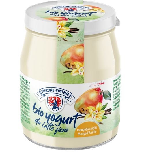 JOGHURT* 80%, Mango-Vanille-Zubereitung 20% (Mangopüree* 10%, Rübenzucker*, Maisstärke*, Verdickungsmittel: Johannisbrotkernmehl*, Bourbonvanilleschotenextrakt*, Bourbonvanillepulver*). GLUTENFREI. *aus biologischer Landwirtschaft.