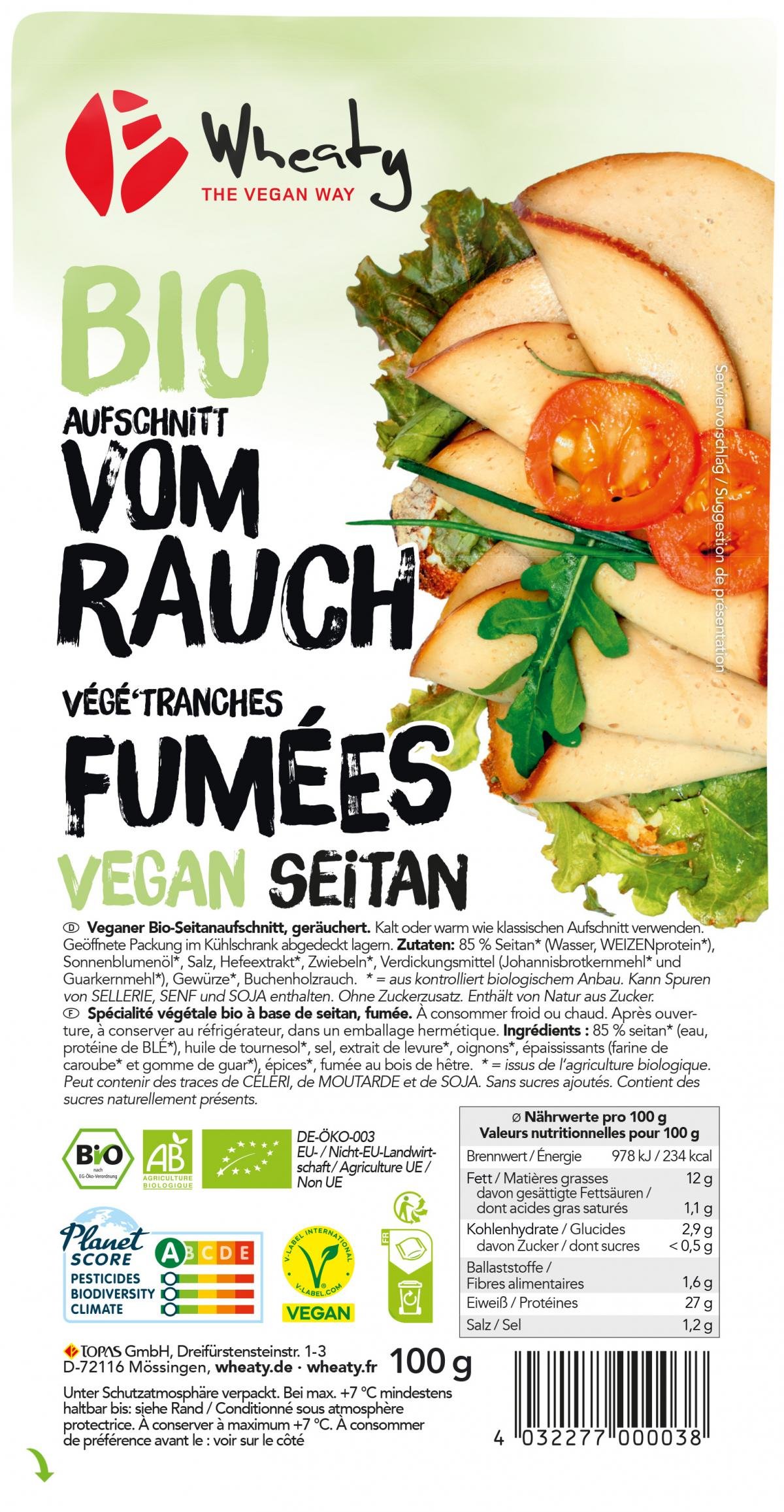 85 % Seitan* (Wasser, WEIZENprotein*), Sonnenblumenöl*, Salz, Hefeextrakt*, Zwiebeln*, Verdickungsmittel (Johannisbrotkernmehl* und Guarkernmehl*), Gewürze*, Buchenholzrauch.